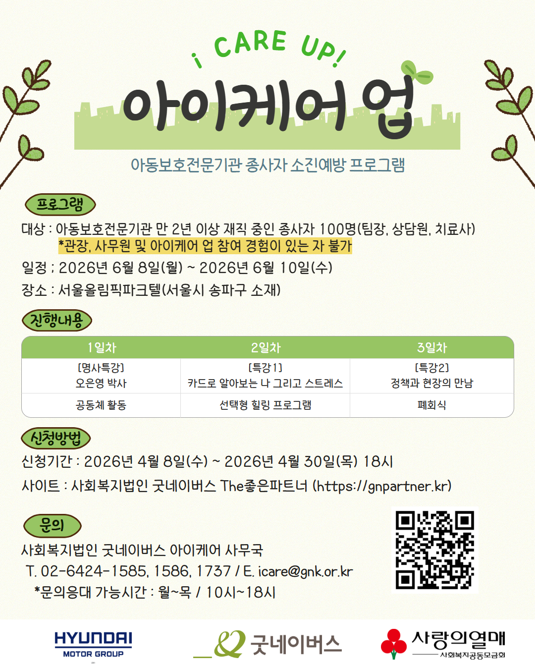 아동보호전문기관 종사자의 소진예방를 위한 '아이케어 업(i CARE UP)'을 다음과 같이 진행하오니 아래 내용을 확인하시어 기한 내 신청 해 주시기 바랍니다.