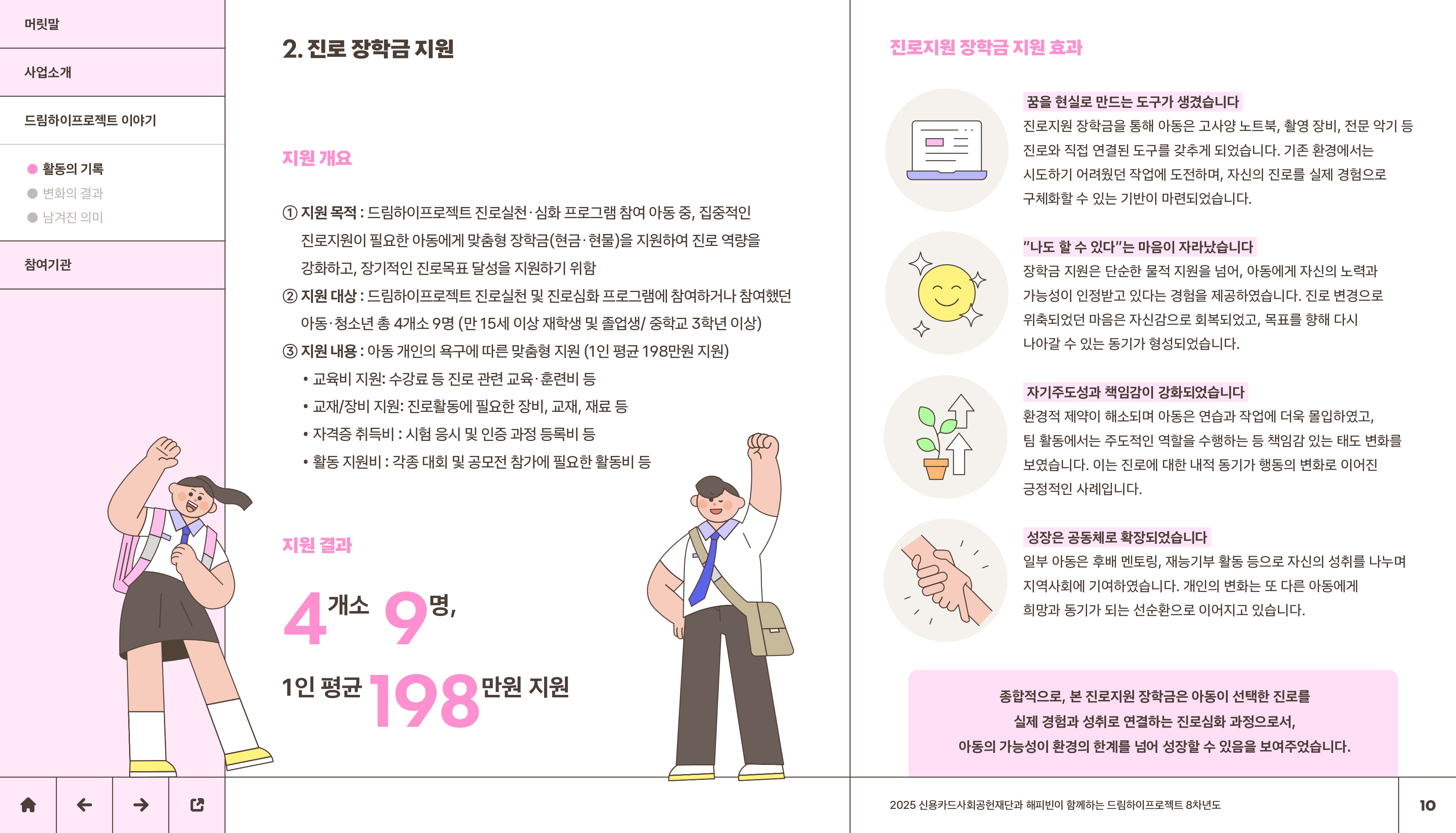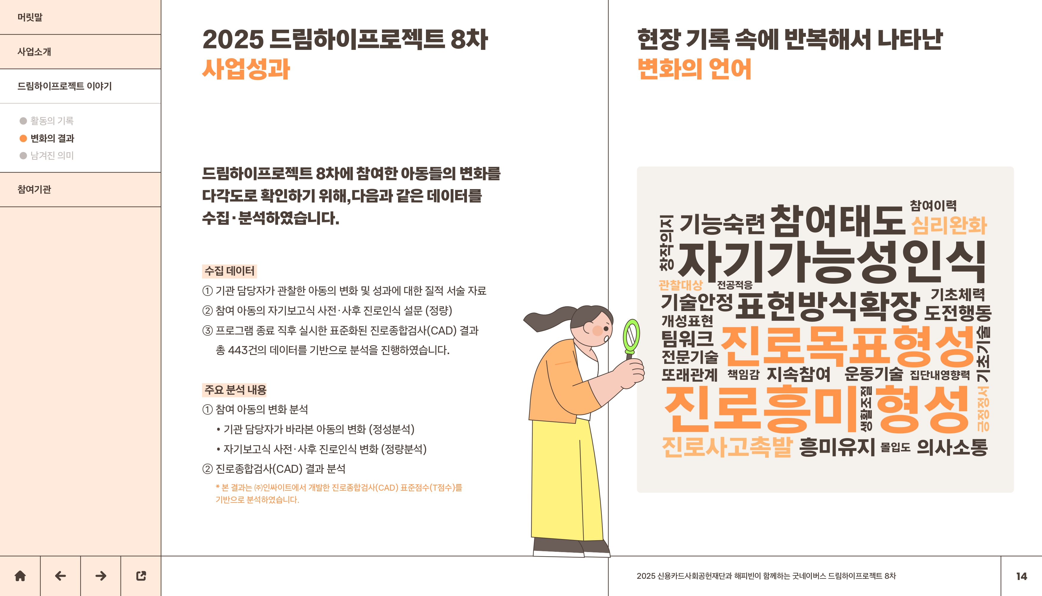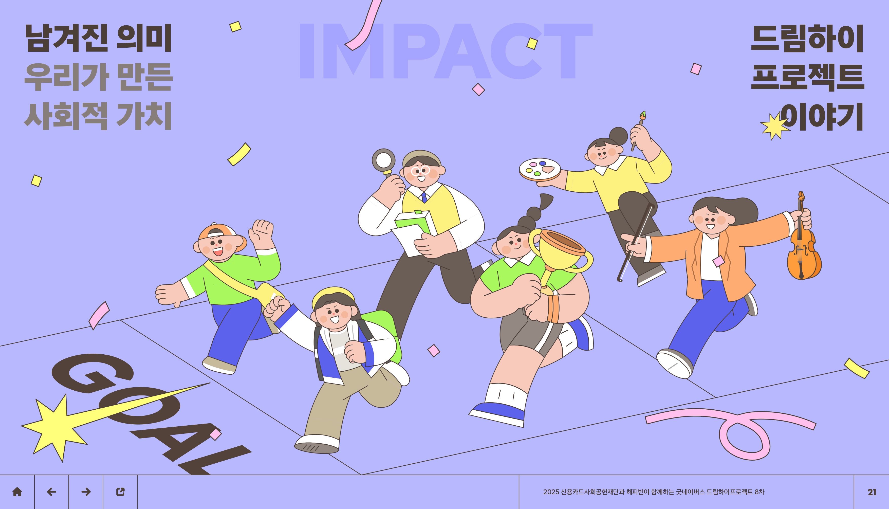 먼저 「2025 신용카드사회공헌재단과 함께하는 드림하이 프로젝트(8차)」 사업에 참여해 주신 모든 기관에 진심으로 감사드립니다.사업의 주요 결과를 온라인 결과보고서로 전달드립니다.