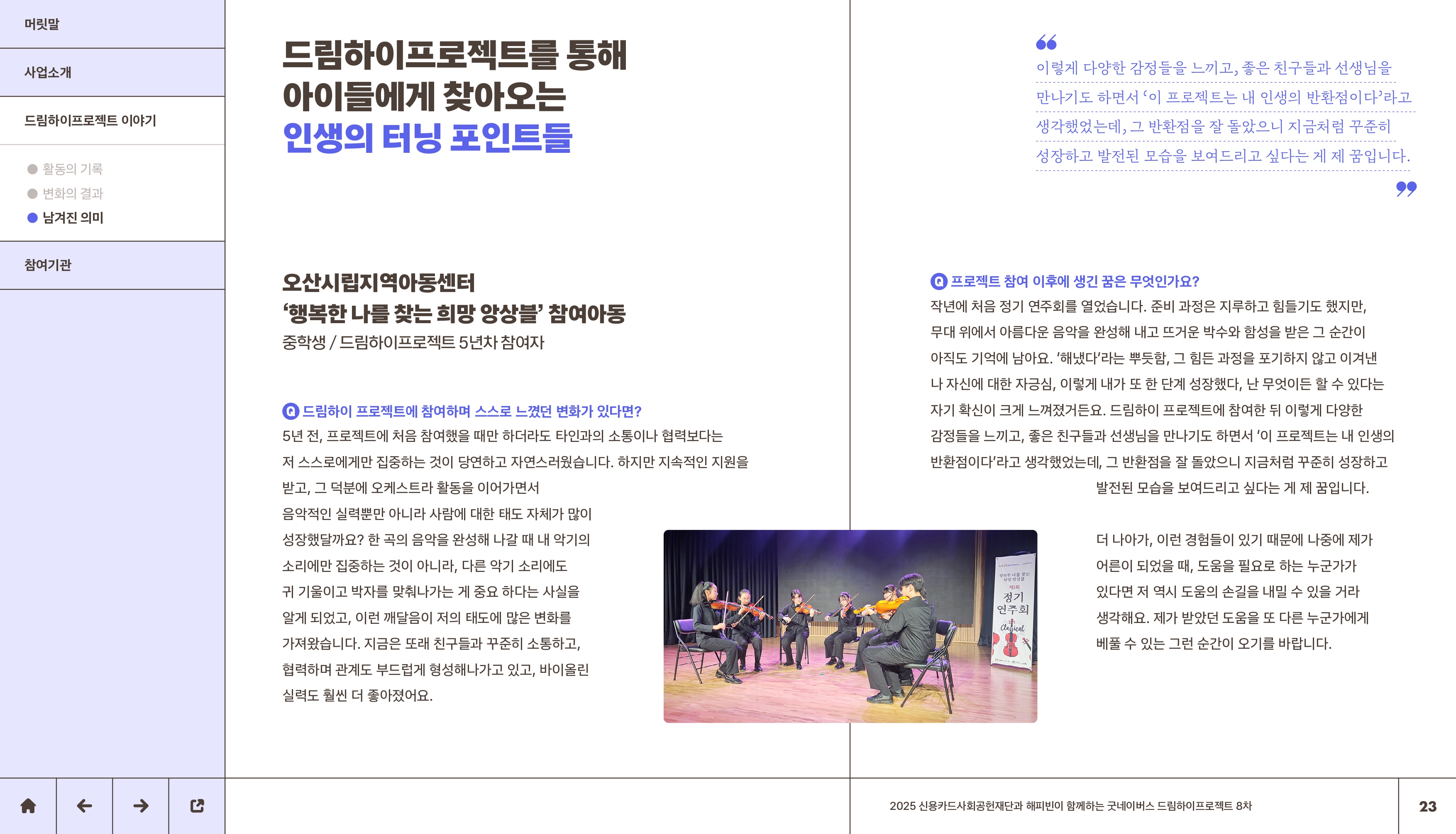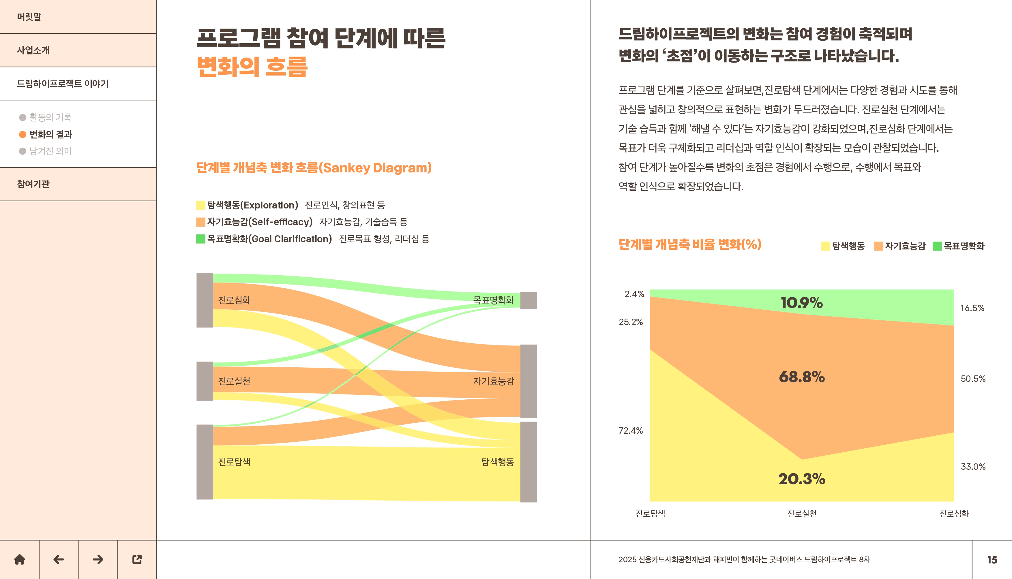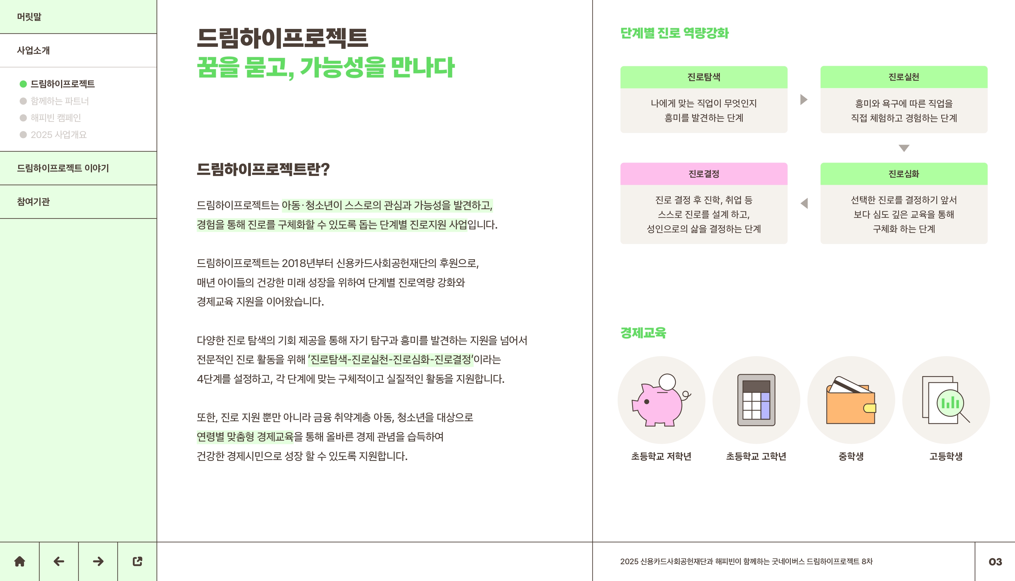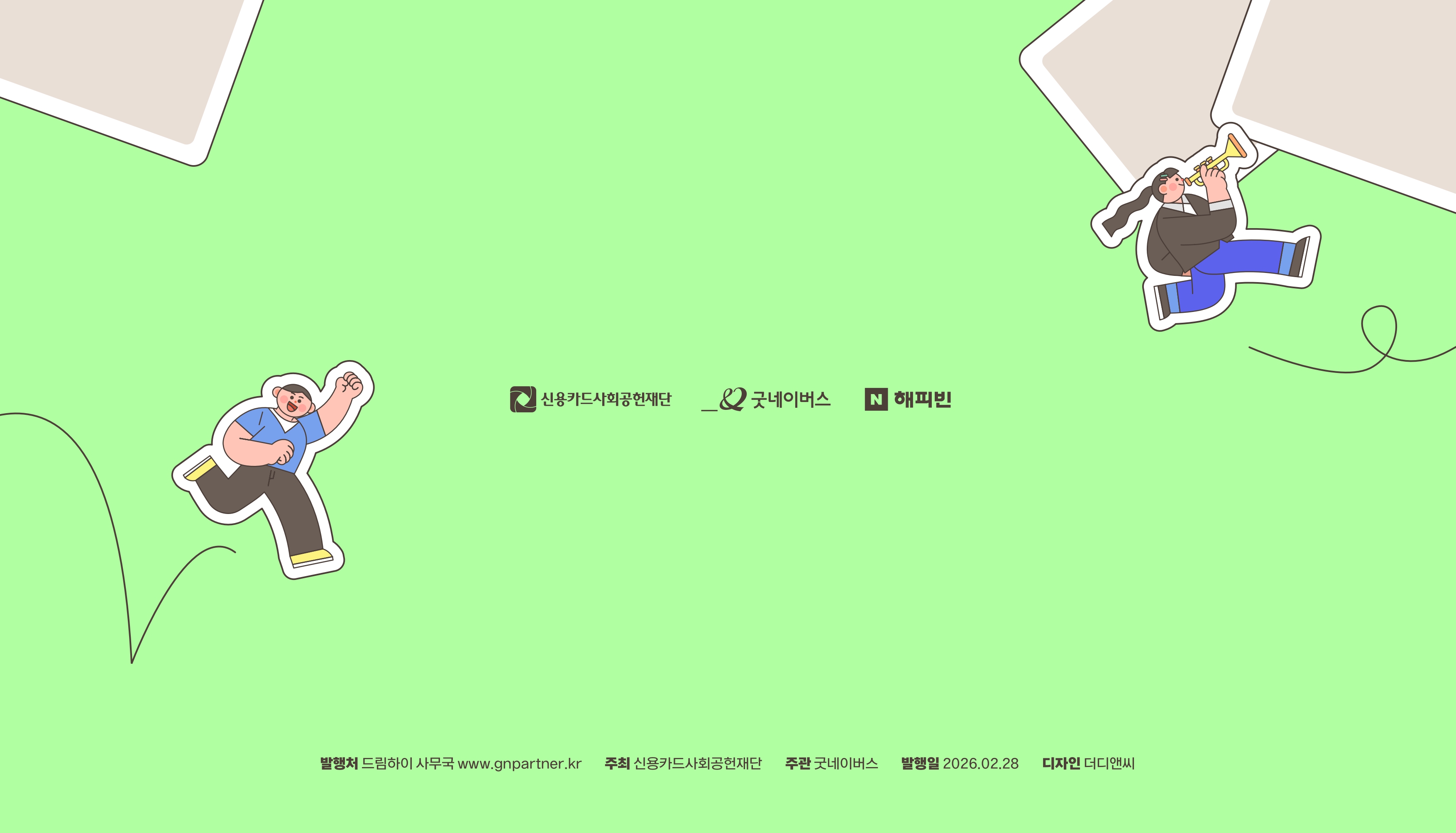 먼저 「2025 신용카드사회공헌재단과 함께하는 드림하이 프로젝트(8차)」 사업에 참여해 주신 모든 기관에 진심으로 감사드립니다.사업의 주요 결과를 온라인 결과보고서로 전달드립니다.