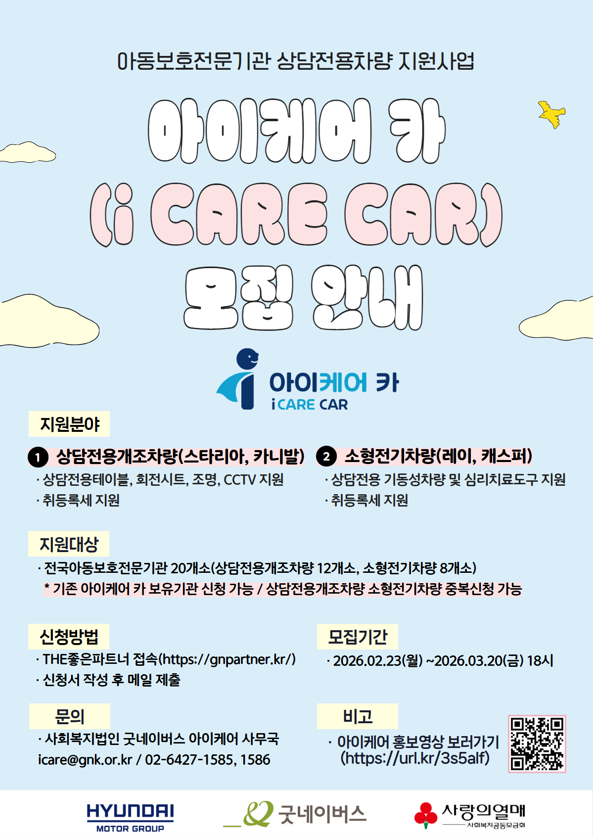 안녕하세요. 현대자동차그룹과 함께하는 아동학대 예방 및 아동보호체계 강화를 위한 통합지원사업 아이케어 사무국입니다.